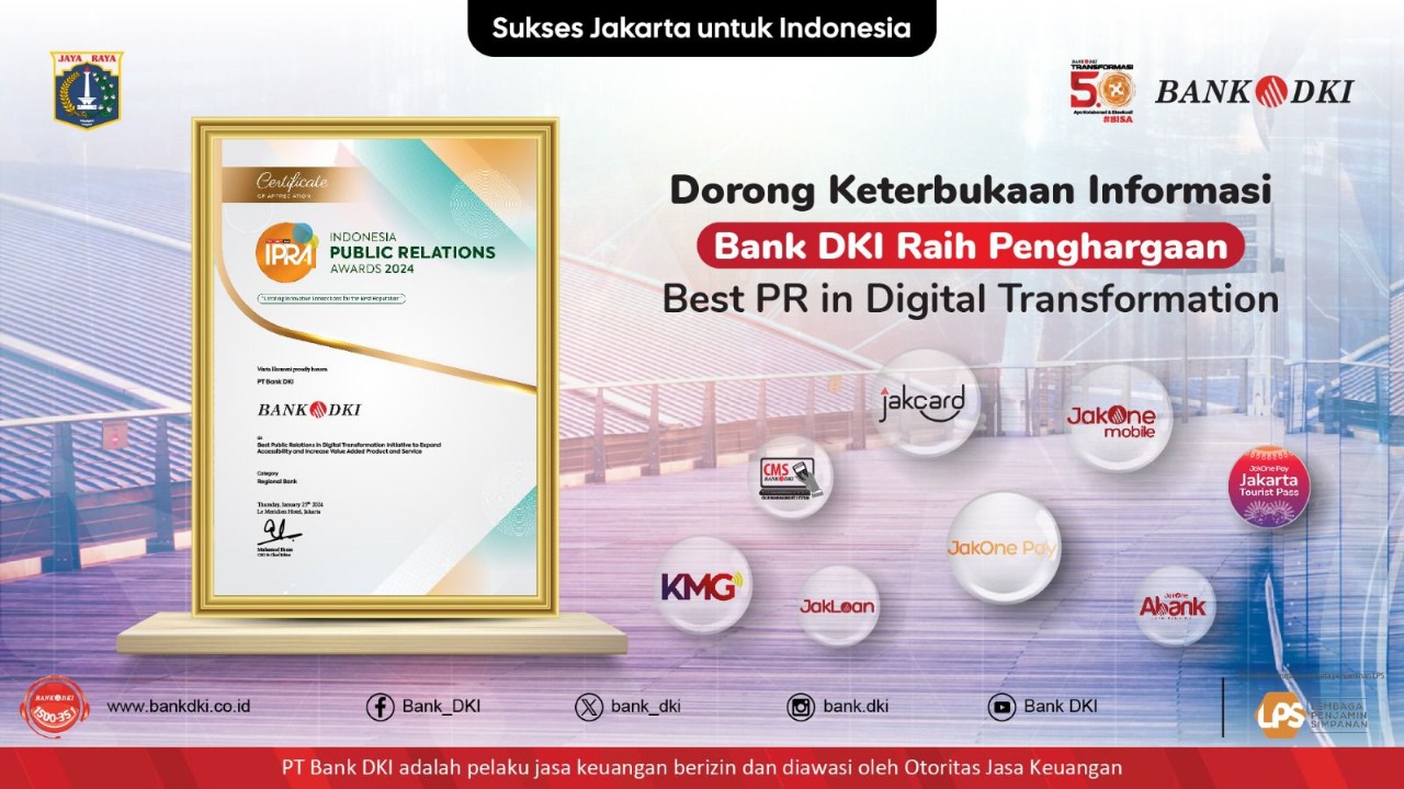 JAKARTA, Stabilitas.id – Raih Prestasi di awal tahun 2024, Bank DKI menerima penghargaan sebagai Best Public Relation in Digital Transformation Initiative to Expand Accessibility and Increase Value Added Product and Service, (Category: Regional Bank) kepada Pemimpin Divisi Investor Relations Bank DKI, Fakhrurroji atas upaya aktif Bank DKI membangun publikasi perusahaan melalui inovasi dan penyampaian informasi kepada publik secara positif.
