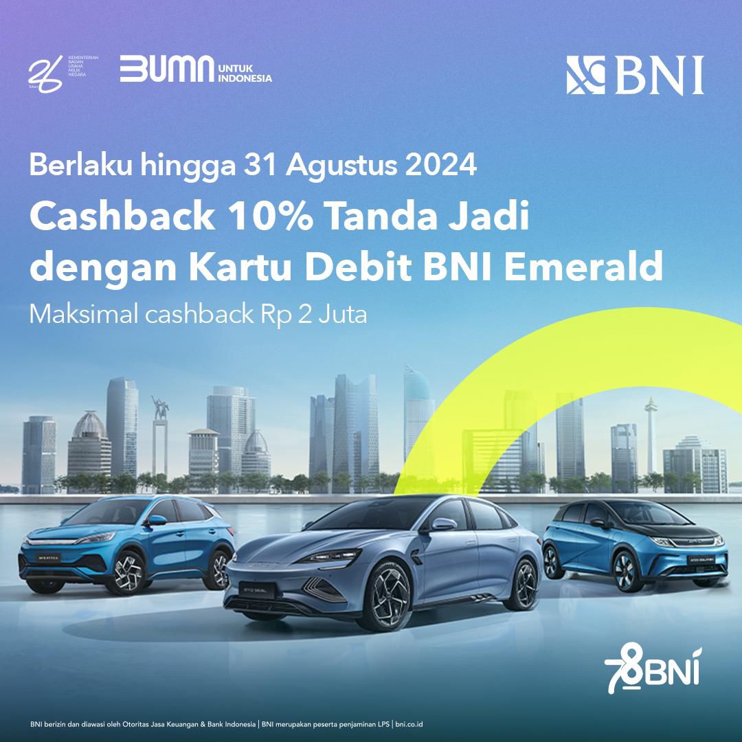 Tidak hanya itu, terdapat juga berbagai penawaran menarik dari BNI, seperti special rate mulai dari 2,5% untuk pembiayaan mobil BYD oleh BNI Finance, cashback hingga 10% untuk pembayaran tanda jadi dengan menggunakan Kartu Debit BNI Emerald dan Kartu Kredit BNI Visa Infinite, serta reward menarik berupa subsidi daya 3200 KWh bagi nasabah yang baru bergabung menjadi BNI Emerald ketika melakukan transaksi pembelian mobil BYD saat acara berlangsung.