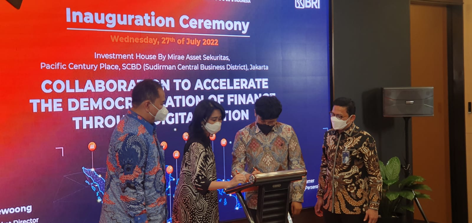 BRI dengan Mirae Asset Sekuritas menyelenggarakan acara Inauguration Ceremony dengan tema “Collaboration to Accelerate the Democratization of Finance through Digitalization”, pada Rabu (27/7/22).