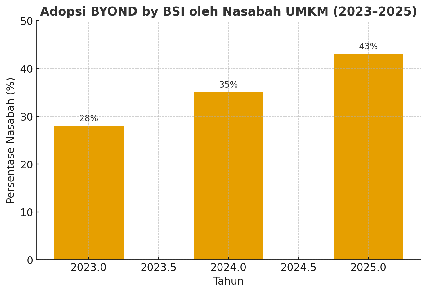 Integrasi layanan juga diperkuat dengan menjadikan 150 UMKM binaan sebagai BSI Agen, yang memasarkan produk syariah sekaligus menyediakan layanan keuangan untuk masyarakat desa. Transformasi digital pun semakin terasa: sekitar 43% UMKM binaan kini sudah beralih menggunakan BYOND by BSI untuk pencatatan dan manajemen keuangan, sebuah langkah yang mempercepat literasi digital sekaligus mendukung transparansi usaha kecil.