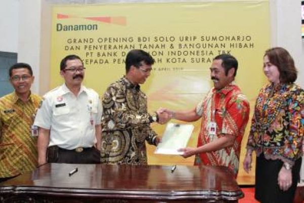 SOLO, Stabilitas– PT Bank Danamon Indonesia (Bank Danamon) hari ini melaksanakan penyerahan kepemilikan atas lahan dan bangunan Kantor Cabang Bank Danamon (KC) Solo Sudirman kepada Pemerintah Kota Surakarta. Prosesi penyerahan ditandai dengan penandatanganan prasasti oleh pejabat dari kedua instansi, disaksikan oleh Walikota Surakarta F.X. Hadi Rudyatmo dan Direktur Bank Danamon Herry Hykmanto beserta segenap jajaran Pemerintah Kota Solo dan Bank Danamon.