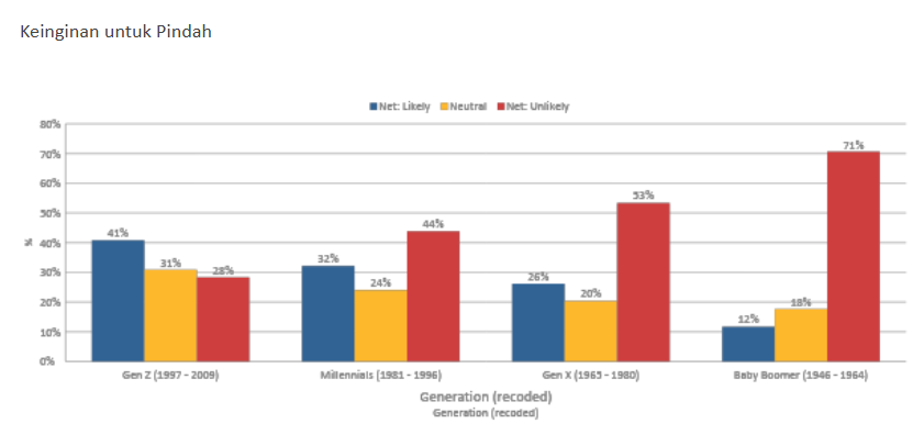 Selain faktor generasi, status pernikahan dan latar belakang profesional juga berpengaruh terhadap niat untuk pindah. Secara keseluruhan, mereka yang belum menikah lebih terbuka terhadap kemungkinan pindah ke luar negeri (42%), sementara mereka yang sudah menikah cenderung memilih untuk tetap di Indonesia (49%).