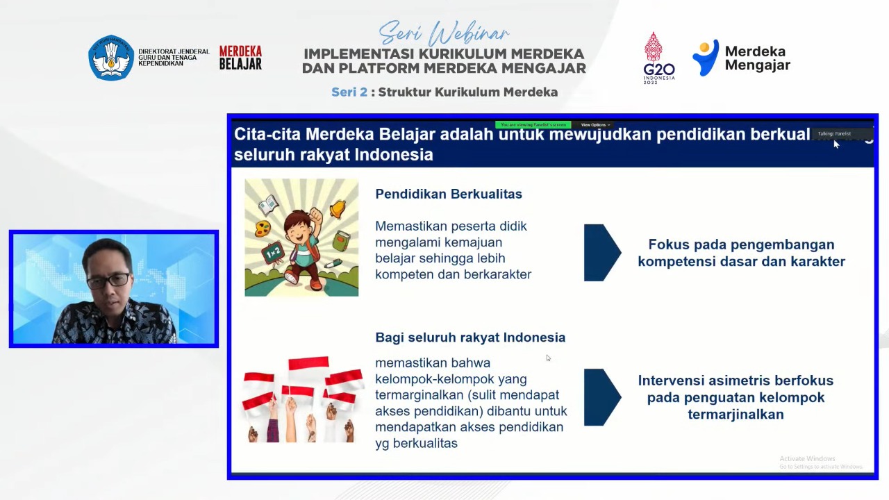Webinar ini mengangkat tema “Struktur Kurikulum Merdeka” dan membahas secara mendalam struktur kurikulum merdeka dan implikasinya pada perubahan mata pelajaran serta pada beban kerja guru.