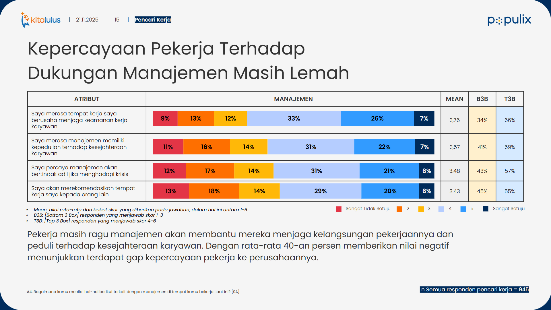 Stabilitas.id – Studi Populix dan KitaLulus mengungkap mayoritas pekerja di Indonesia masih menilai proses pemutusan hubungan kerja (PHK) dilakukan secara tidak manusiawi karena dianggap belum transparan dan adil. Survei ini dilakukan secara daring pada 15 Oktober hingga 7 November 2025 dan menjangkau 945 pekerja serta pencari kerja, serta 74 praktisi human resources (HR).