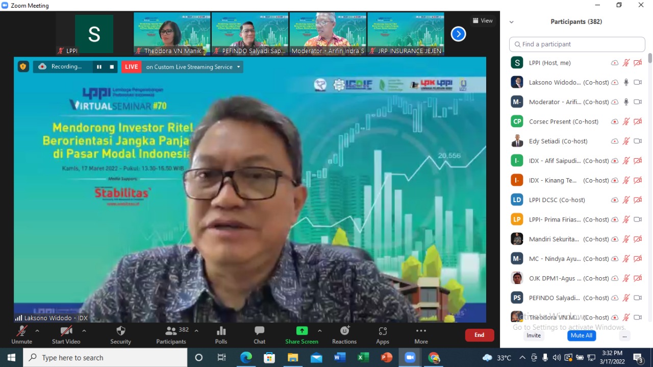 “Pasar modal bagi pengusaha tentunya adalah sebagai sumber pembiayaan selain bank, dan juga bagi negara adalah soal keterbukaan, professional, dan iklim usaha yang sehat,” ungkap Direktur Utama LPPI, Mirza Adityaswara saat membuka Virtual Seminar ke-70 LPPI dengan tema ‘Mendorong Investor Ritel Berorintasi Jangka Panjang di Pasar Modal Indonesia’, Kamis (17/3/2022).