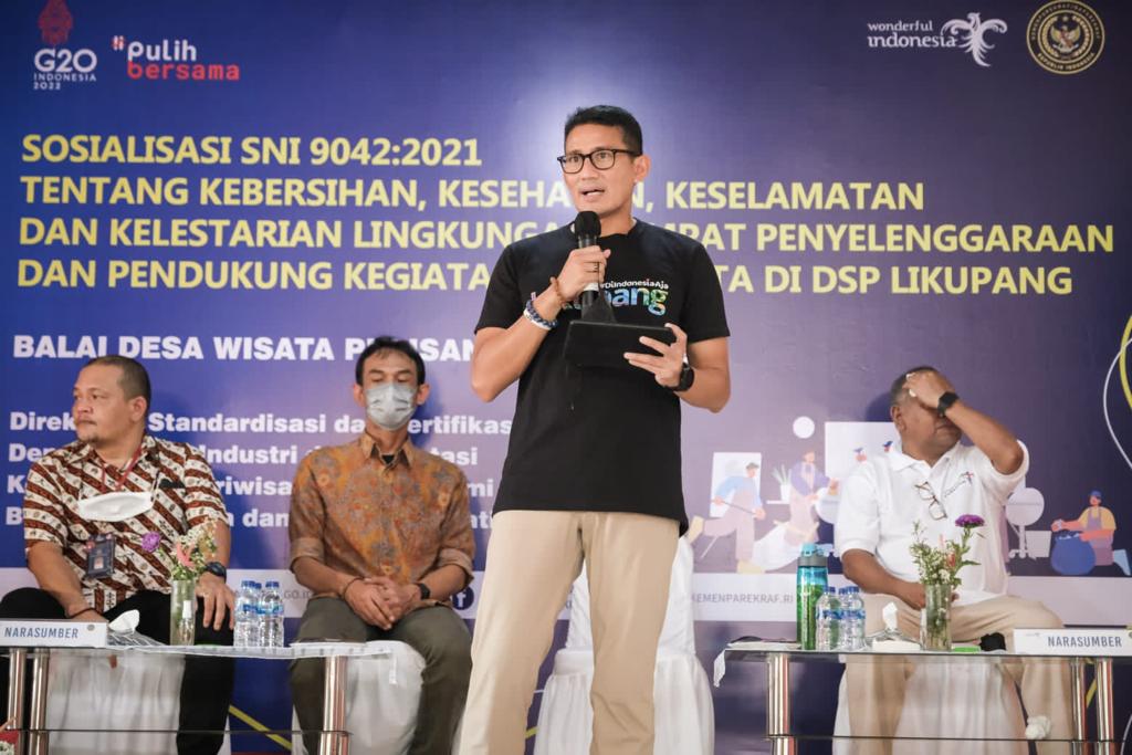 JAKARTA, Stabilitas.id – Menteri Pariwisata dan Ekonomi Kreatif/Kepala Badan Pariwisata dan Ekonomi Kreatif (Menparekraf/Kabaparekraf) Sandiaga Salahuddin Uno menekankan pentingnya sertifikasi SNI 9042:2021 tentang kebersihan, kesehatan, dan keselamatan bagi pelaku usaha wisata di sekitar kawasan destinasi super prioritas Likupang, Sulawesi Utara (Sulut).