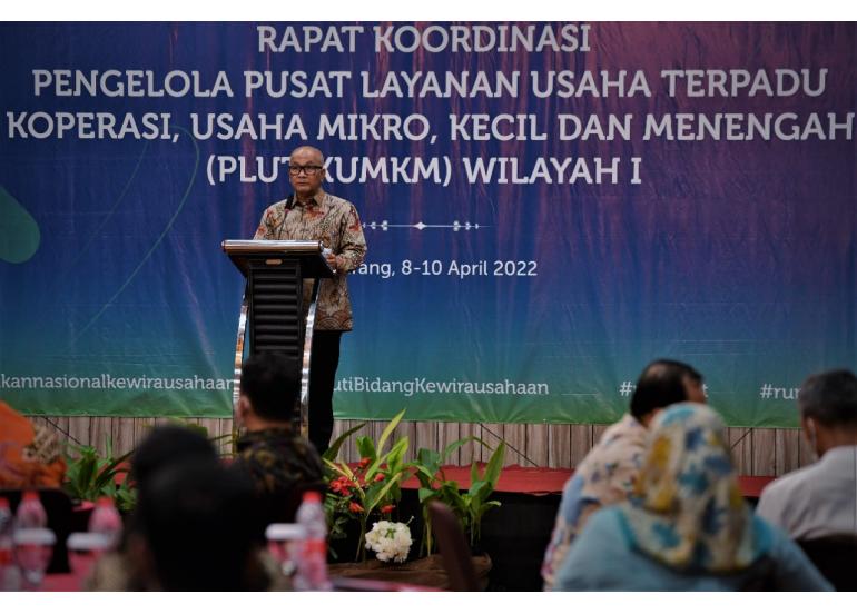 SesKemenKopUKM Arif R Hakim membuka dan memberikan pengarahan pada Rapat Koordinasi Pengelola PLUT KUMKM Wilayah I, Jum’at (8/4/2022) di Semarang, Provinsi Jawa Tengah.