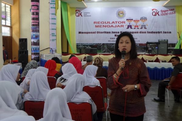 Medan – Selain kegiatan workshop perlindungan konsumen sektor jasa keuangan, Otoritas Jasa Keuangan (OJK) juga menggelar kegiatan Regulator Mengajar yang dilakukan di SMP Harapan 1 Medan. Anggota Dewan Komisioner OJK Kusumaningtuti S Soetiono Kusumaningtuti berkesempatan memberikan pelajaran mengenai keuangan kepada ratusan anak kelas 2 SMP Harapan 1 Medan.