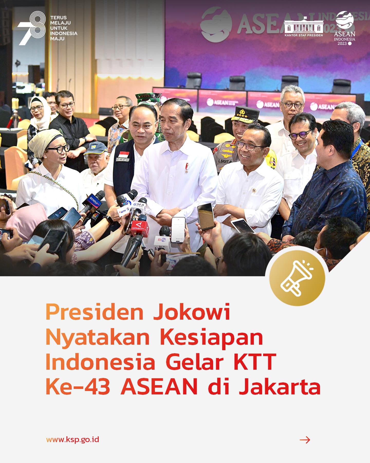 “Persiapan sudah mencapai 99 persen, sudah siap,” ungkap Presiden Jokowi di Media Center KTT ke-43 ASEAN, JCC, Jakarta, Jumat (1/9/23).