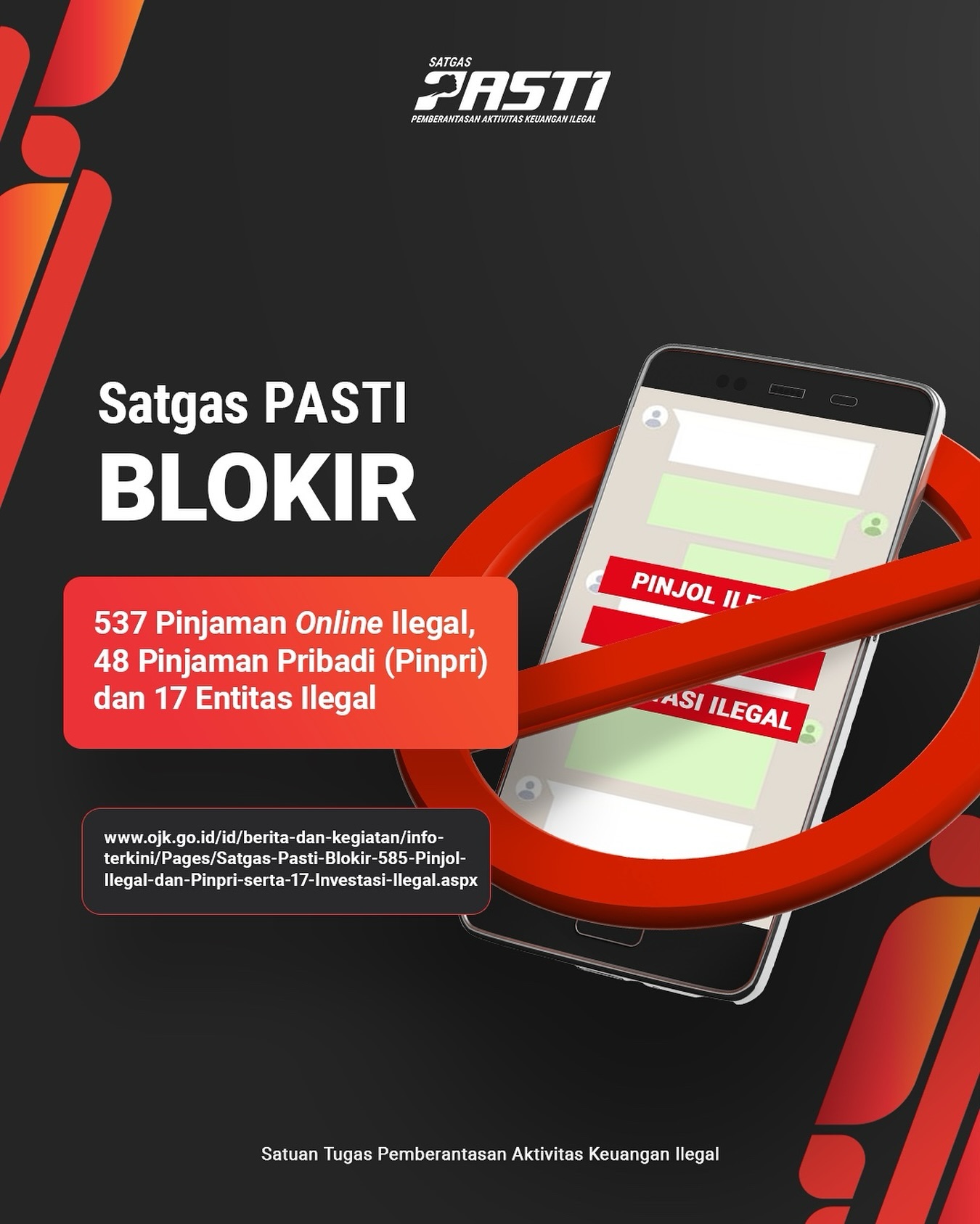 Sebagai informasi, masyarakat yang menemukan informasi atau tawaran investasi dan pinjaman online yang mencurigakan atau diduga ilegal atau memberikan iming-iming imbal hasil/bunga yang tinggi (tidak logis) untuk melaporkannya kepada Kontak OJK dengan nomor telepon 157, WA (081157157157), email: konsumen@ojk.go.id atau email: satgaspasti@ojk.go.id.***