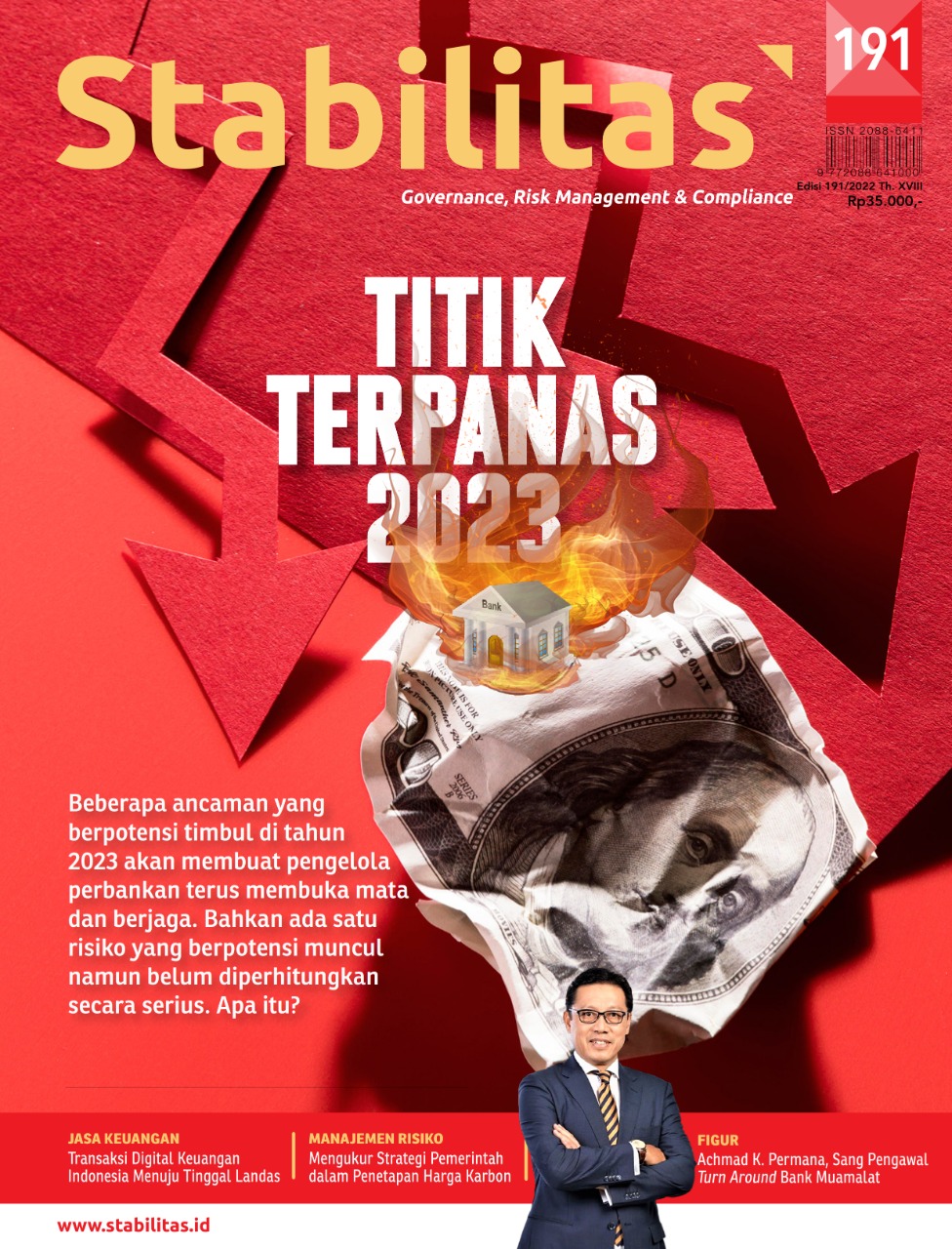 Nah. pada edis kali ini Majalah Stabilitas akan manghadirkan pembahasan mengenai tantangan-tantangan yang bakal dihadapi perbankan tahun 2023 pada laporan utama. Pada tulisan pembuka, akan dihadirkan pembahasan tentang risiko-risiko yang sudah muncul dan menjadi peringatan di 2022. Sebagaimana sering diungkap oleh beberapa riset global bahwa setidaknya ada tiga risiko utama bagi sektor keuangan yaitu risiko resesi, risiko terkait inovasi teknologi, risiko iklim atau ESG. Bahkan muncul satu yang baru yaitu risiko fragmentasi.